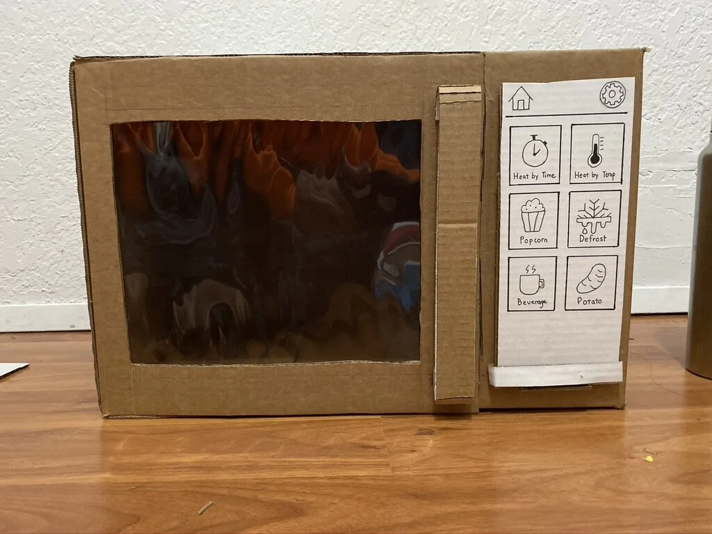 We created a physical 3-dimensional cardboard model prototype with the intention of using this design in the usability testing process. Microwaves are appliances users directly interact with, therefore we thought that a 3-D physical prototype would offer the most realistic interaction experience for our usability testers.
