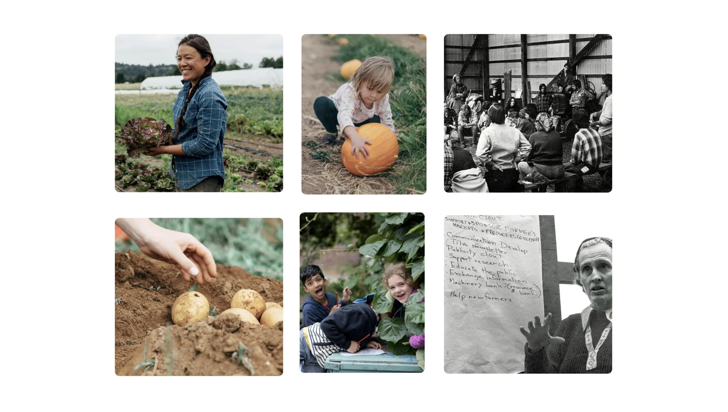 Tilth’s images are active and lively. Images show people working on a farm and/or interacting with one another.