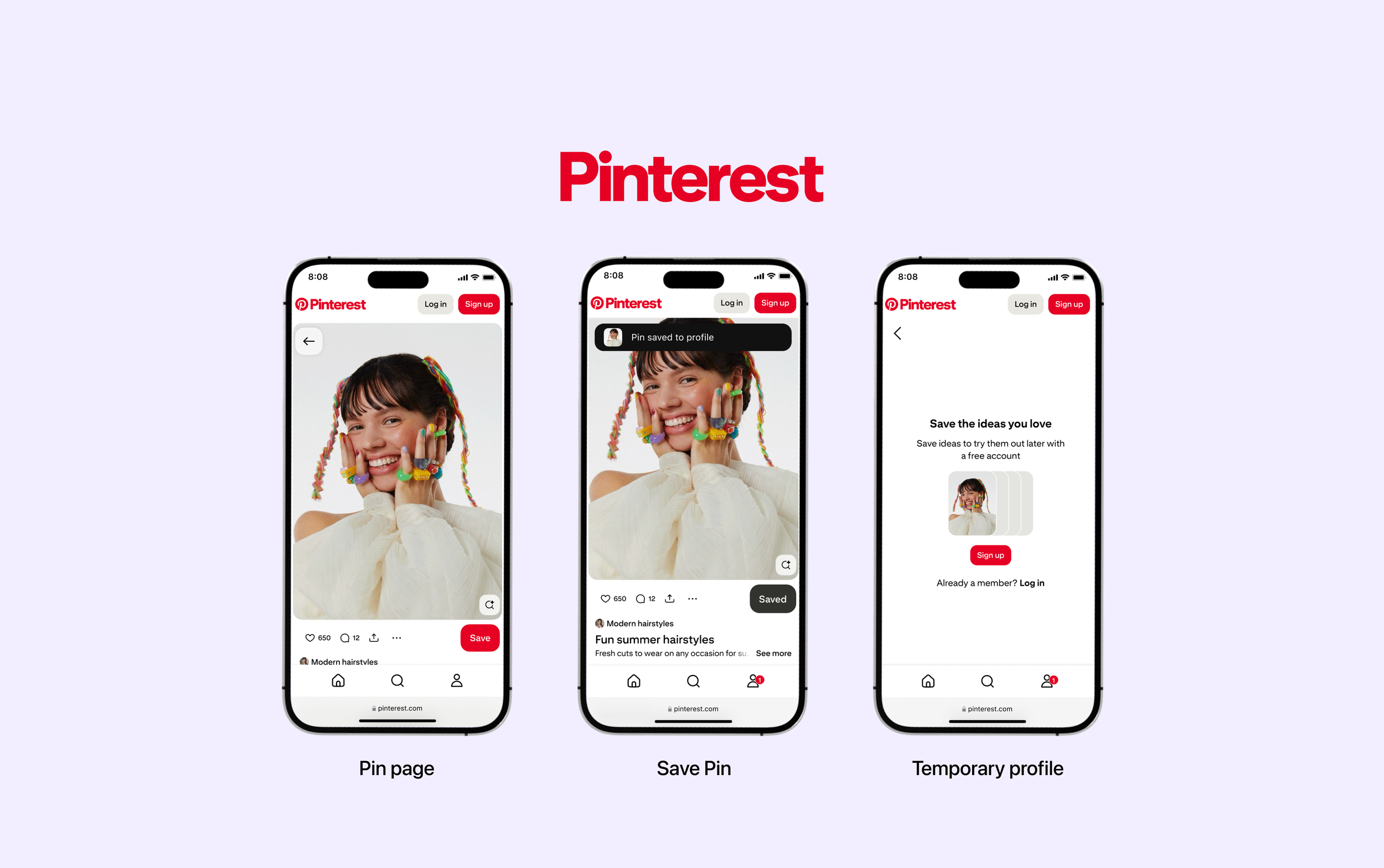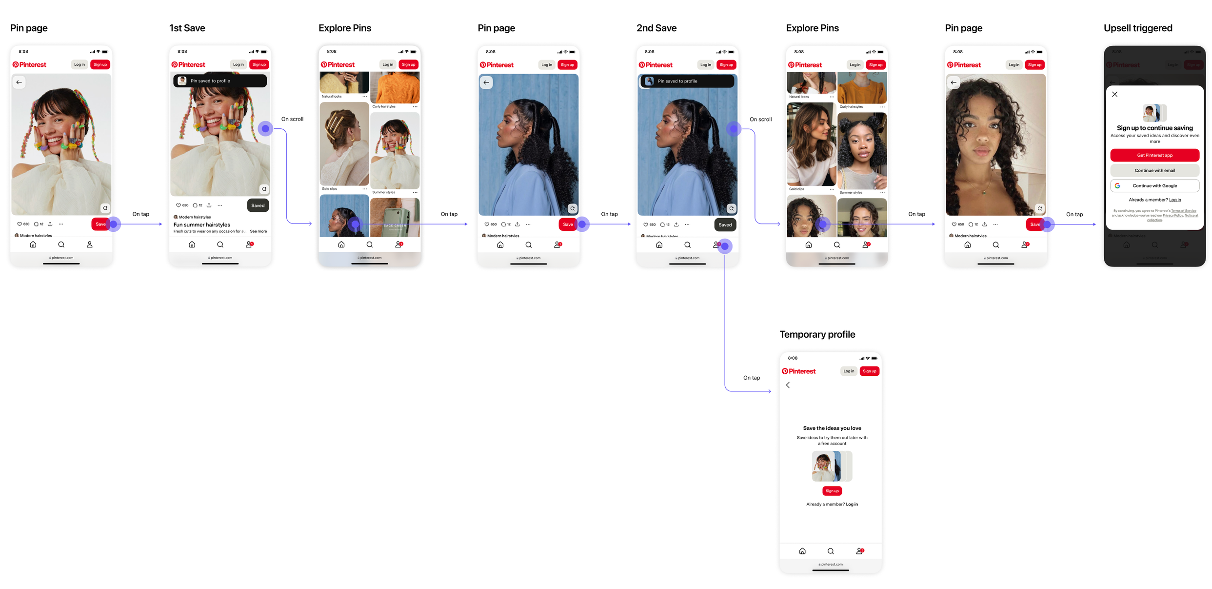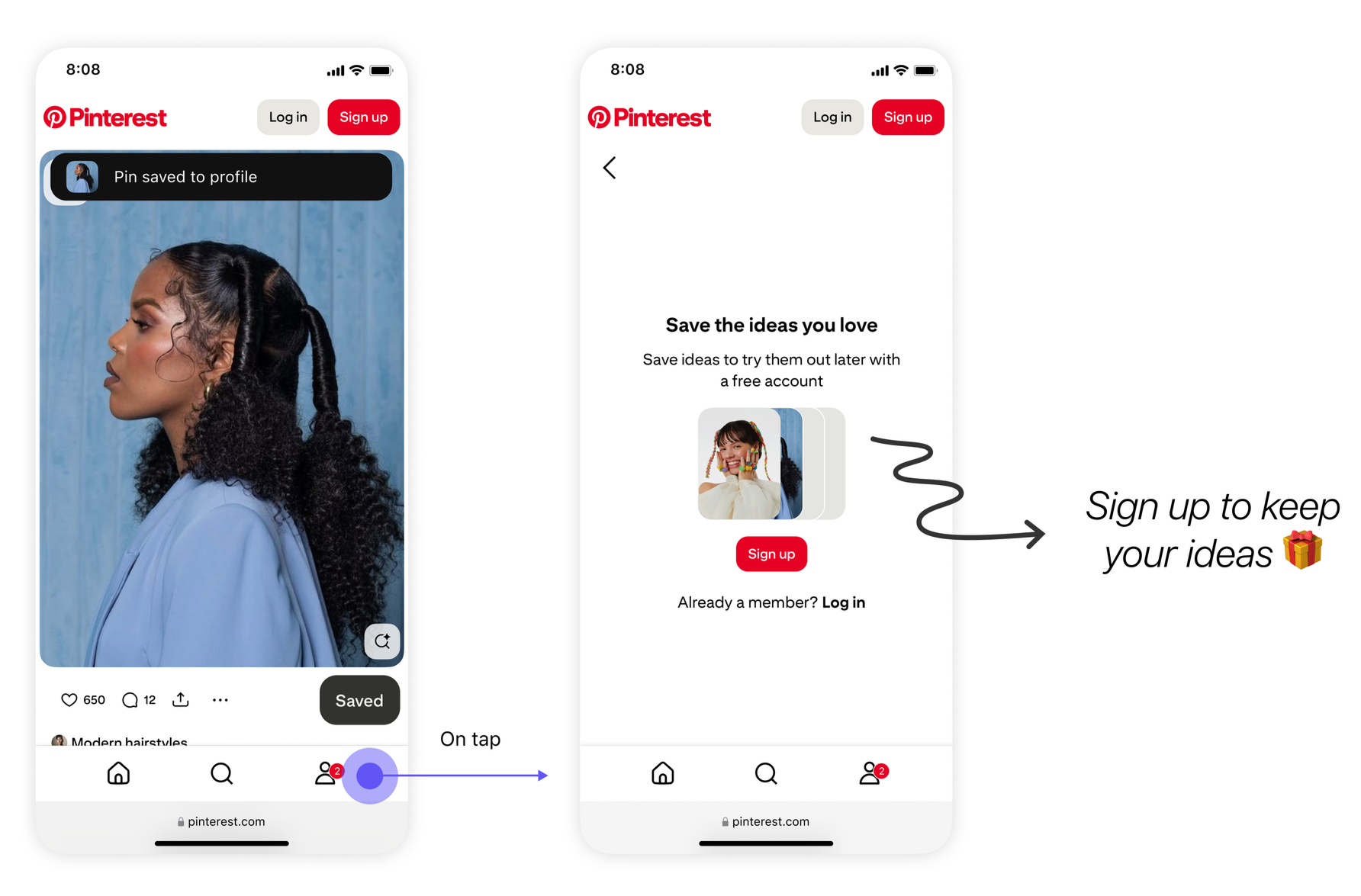 We tested four variants, each measuring the incremental impact of allowing users to save while logged out. Their ideas were saved to a temporary profile that could be accessed during their session. Once users converted, their ideas would be permanently saved to their Pinterest profile.