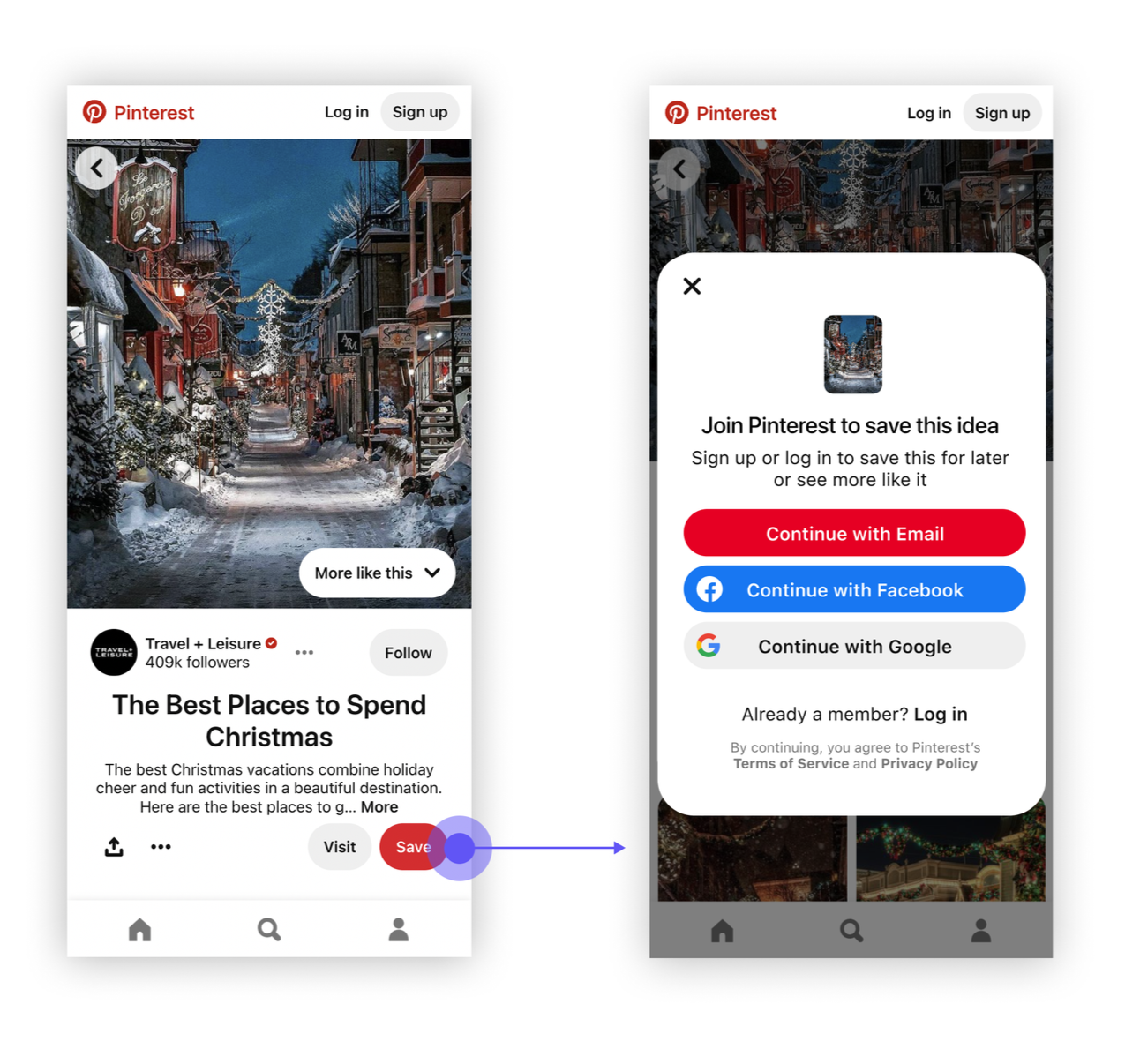 This project aimed to help logged-out users understand the benefits of Pinterest's “Save” feature by allowing them to save a limited number of ideas and access them later with an account. This allowed users to experience the feature's value before converting.