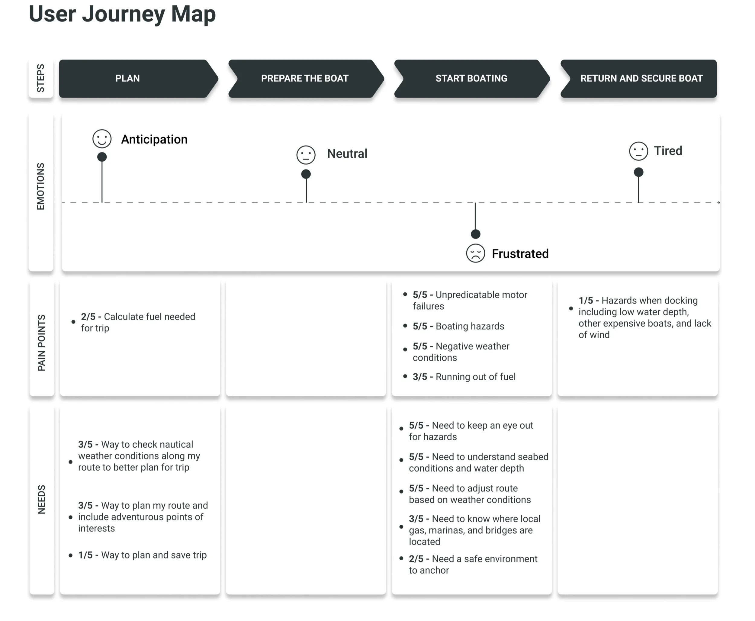 We created a user journey map and categorized user boating activities into 4 main steps: Plan, Prepare The Boat, Start Boating, Return And Secure.